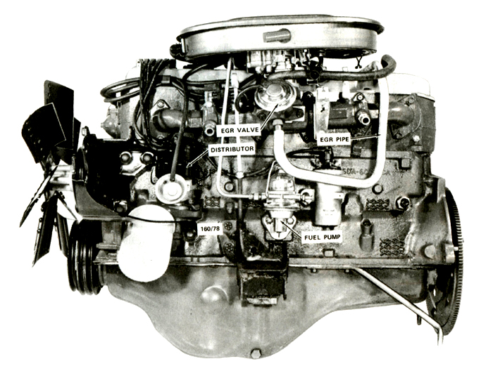 the XC model range from 1976 remained overall, generally the same as its XA-XB predecessors. The most obvious difference to the eye on lifting the bonnet now is the re-shaped, elongated air filter housing and the addition of several tubes and fittings for emission control requirements. In conjunction with this, the sixes also now had 'cross-flow cylinder heads' for greater efficiency. The Falcon Six came in two sizes - the 3.3L and 4.1L but were built on the same sized, and almost identical, block. The 4.1L motor has a longer stroke which creates a greater capacity and so a greater horsepower output. The engine block, cylinder head and crankcase are cast iron with the cylinders numbered 1 to 6 from the front. There is a 12-value (Inlet / Exhaust) overhead cam arrangement with the camshaft driven by a morse chain and sprockets from the crankshaft. The crankshaft and flywheel are supported by seven main bearings. The pistons have two compression rings and an oil ring with the connecting rods of H section forged steel. The electrical system is 12 volts with coil and alternator. The engine oil capacity is 4.5 litres with a radiator (coolant) capacity of 8.5 litres. Emission control is accomplished with four new systems: 1) Positive Crankcase Ventilation (PCV) - a closed system that uses fresh air drawn from the air filter housing to force pollutant fumes from the crank housing into the inlet manifold. 2) Controlled Combustion System (CCS) - an intake air pre-heating system in the air filter housing. 3) Evaporative Control System (ECS) - reduces vapour loss from the vehicle's fuel tank and carburettor by trapping vapours which are then fed into in the induction system. 4) Exhaust Gas Recirculation (EGR) - circulates up to 15% of exhaust gases back through the cylinders reducing engine pollutants. |