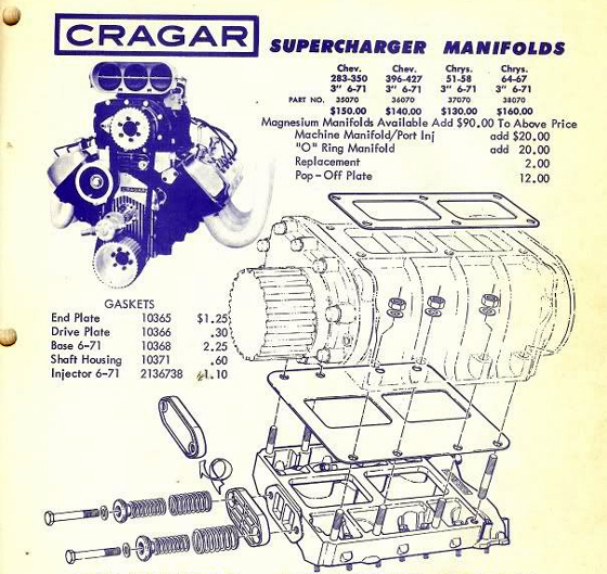 ![]() Only a Cragar backing plate was used in the film but this 1960s advertisement schematic of a Cragar compressor unit shows to good effect how it bolts onto the engine intake manifold. |