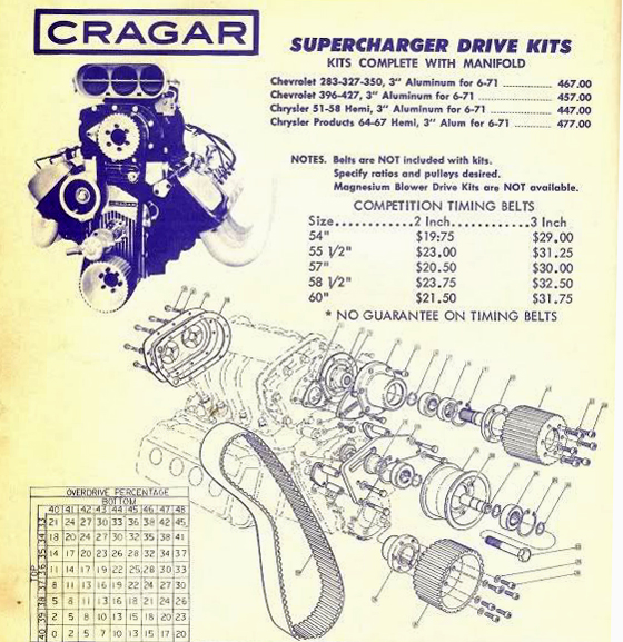 ![]() Parts list schematic for a Cragar Supercharger rotor casing gearbox and pulley assembly from a 1960s advertisement. |