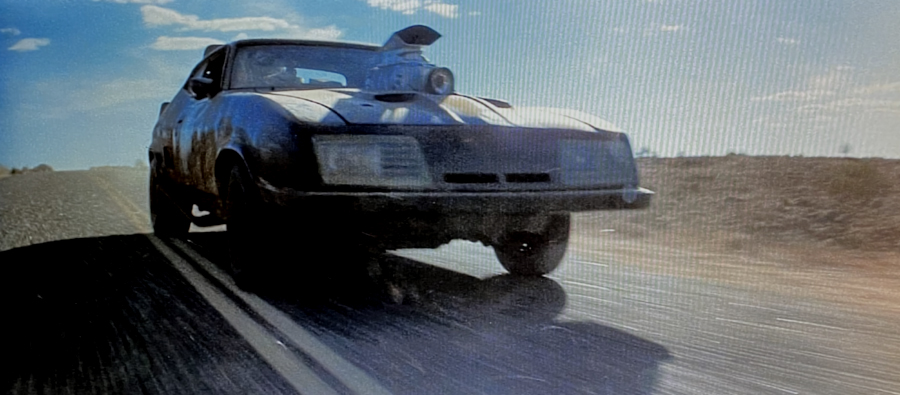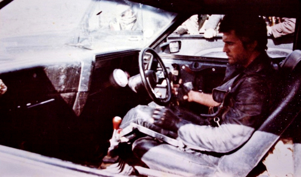 ![]() The #1 original car was used for interior close ups and detail shots. It was however seen in one driving shot (pictured above), during the opening chase where Max looks at his side mirror - the camera then pans left to reveal marauders appearing on the road behind him. When Bob Fursenko later acquired the car he discovered the camera platform mounting brackets from this shot still attached along the underside. |