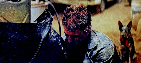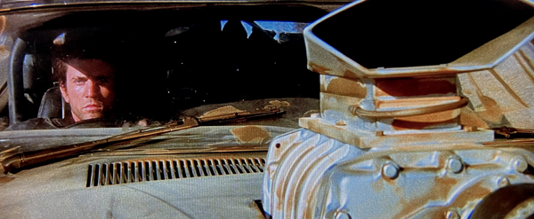 except the MFP badges are now gone and extensive rust and dirt weathering has been added by the film's art department over most parts of the car. A small detail is the AM radio aerial on the upper left-side fender tucked away in the first movie but removed altogether in the second film leaving a hole. This is evident in the scene when the Feral Kid climbs over the passenger door to fetch his musical toy. |