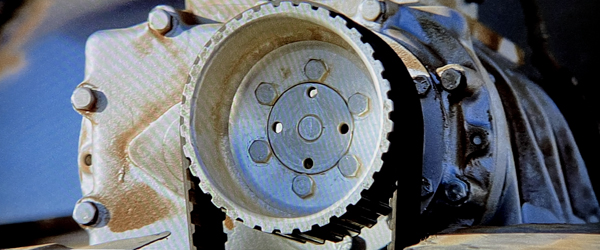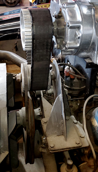 ![]() Two views of the #1 original Interceptor belt and pulley system set up to spin the fake supercharger drive pulley wheel. It was driven off the engine crankshaft via a tensioned v-belt that could easily be removed or installed depending on what was required for filming. The supercharger starting up was simply done by starting the car's engine or turning it off to show it stopping. Photos: Robert Sandler. |