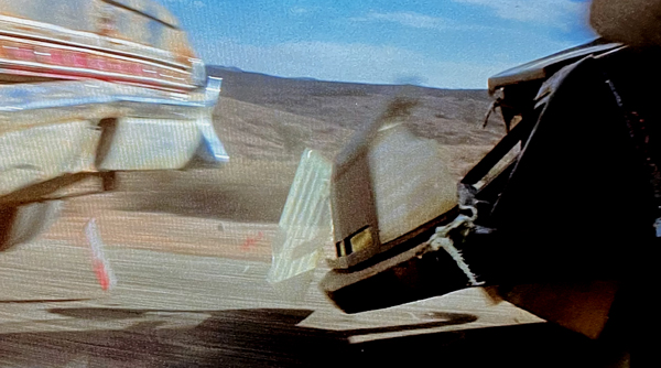 ![]() The moment in Mad Max 2 when the #2 stunt car smashes it's Concorde nose off by ramming a Ford Landau. This chase was filmed along Wilangee Road outside Silverton in May, 1981. |