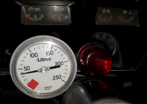![]() A fuel gauge and warning lamp was installed but at the expense being able to see the engine tachometer. Note the top row GT gauge needles are positioned / / / / and it has the standard GT 140mph speedometer with 7k tachometer. Photo: Robert Sandler. |