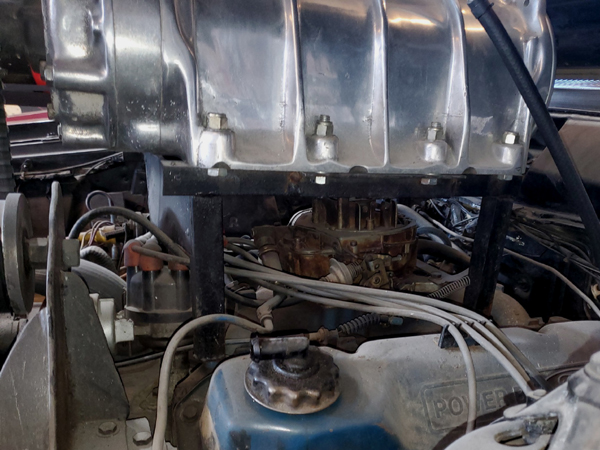 ![]() The Detroit Diesel base unit was mounted on top of the original 4V carburettor by a welded steel frame as seen here in this detailed image of the preserved #1 original car. The original GT 4V carburettor was run without the use of an air-filter. Photo: Robert Sandler. |