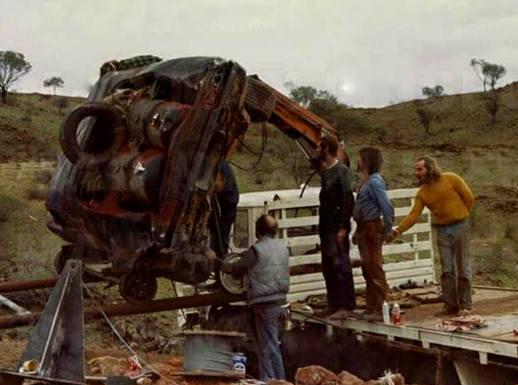 ![]() ...the steep ravine crash scene which was filmed at Red Hill 15km South of Broken Hill by rolling the Fairmont wreck off a parked truck via a steel cable release. Photo: via David Larter. |