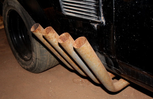 | The 8-pipe upturned zoomie exhausts have been modified for