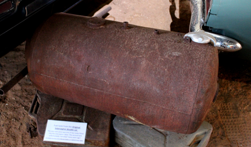 ![]() The only surviving external fuel tank from the #2 stunt car. It measures 900mm long by 450mm in diameter for a capacity of 143 litres. It is now on display at Adrian Bennett's Mad Max 2 Museum at Silverton, NSW. Photo: Simon Beck. |