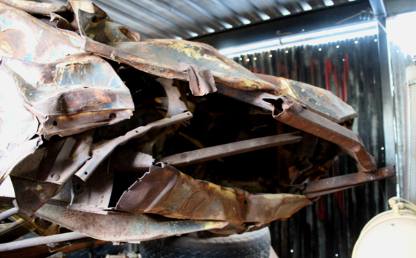 ![]() The #2 stunt car front grille as it looks today. Only steel frame sections of the customised Concorde nose survived the movie rear-end smash (movie image above), and later crash and roll stunt. Photo: Simon Beck. |