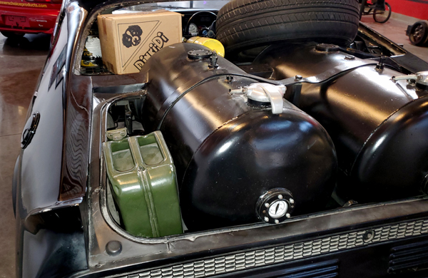 art department and mounted under the car next to the left rear leaf-spring. It's story purpose is to spark fuse wire leading into the external fuel tanks in the event the fuel caps are tampered with. |