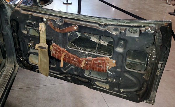 ![]() The driver's side door still has the remains of the film production props - what looks to be a machete sheath, a WWI ammunition belt and an improvised leather door handle. Photo: Robert Sandler. |