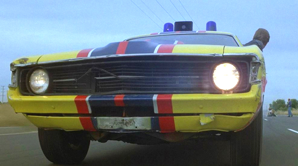 The XA Falcon known as March Hare seen here in the later part of the film's opening chase but now with the front lower air dam missing and no flares on the left-side wheel arches. |