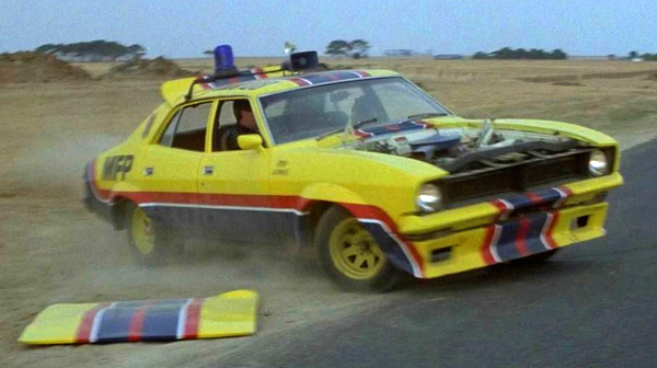 Max and the Goose arrive at a terrible scene of carnage outside the fictional town of Little Jerusalem. Evident here is the standard Falcon fuel cap and Holden Torana styled wheel flares. |