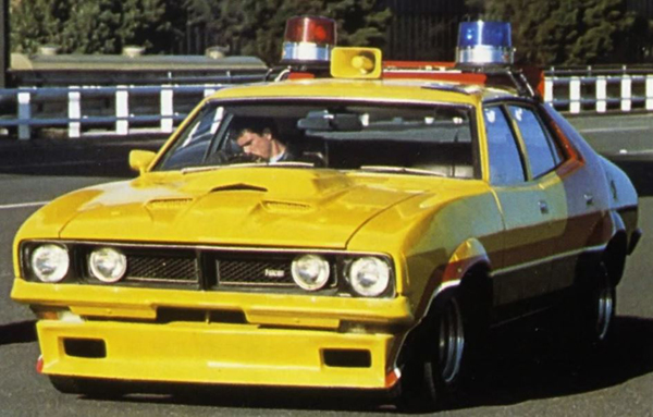 and mayhem on the "Transcontinental Highway" of the near future, Australian filmmakers George Miller and Byron Kennedy decided upon the use of the Ford Falcon as the main police car of this science fiction tale. Designated as either Pursuit and Interceptor vehicles, these mainly yellow four-doors were the front line defence for the Main Force Patrol (MFP), a specialised police force charged with breaking gang led dominance on outback roads. Three 1970s era Falcon sedans were acquired for filming from October to December, 1977. All vehicles were modified by Melbourne based custom car company Graf-X International with many of the fibreglass parts coming from Errol Platt's EWP Fibreglass company. The first was a former Melbourne 1972 Ford XA Falcon 500 Sedan taxi cab, a six cylinder, column shift with bench-seating for the role of an Interceptor driven by Scuttle and Sarse - call sign March Hare. It had a blown cylinder evident in the film by the plume of exhaust smoke in several shots. It was destroyed during filming by running it into a phone booth and flipping it onto it's roof. The second was a former Victorian police 1974 Ford XB Falcon 500 Sedan which was a 302ci V8 with auto column shift and bench-seating for the role of a Pursuit four-door driven by Roop and Charlie - call sign Big Bopper. It was known by the film crew to be the most spritely of the all the cars in the production due to it's good condition V8 motor. It was extensively damaged during filming performing stunt work involving being rammed off the road, hitting a painter's van and driving it through a caravan. The third was a few levels up being a genuine, former Victorian police highway pursuit car. A 1974 Ford XB Falcon 500 Sedan fitted with a 300 hp GT V8 engine (351ci / 4V), 4-wheel disc braking, limited slip differential, dual exhaust pipes, GT bonnet scoops with four headlight front grille that carried a 'Falcon' badge not a GT one. On the inside it had 'saddle' trimmed reclining bucket seats with T-bar auto floor transmission but not a GT dashboard - just the usual Falcon 500 type. Ford required carpets as mandatory with bucket seating and sports console but police cars were exempt with this Falcon having rubber mat flooring. The paint finish was slightly different from the other two Falcons in that the red pin-stripe was widened at the rear and it had silver mag wheels rather than a yellow set. It was used for the role of Max's four-door Interceptor and what happened to it after filming remains a mystery to this day... For details on the two-door black Interceptor see under: The Interceptor: Mad Max |