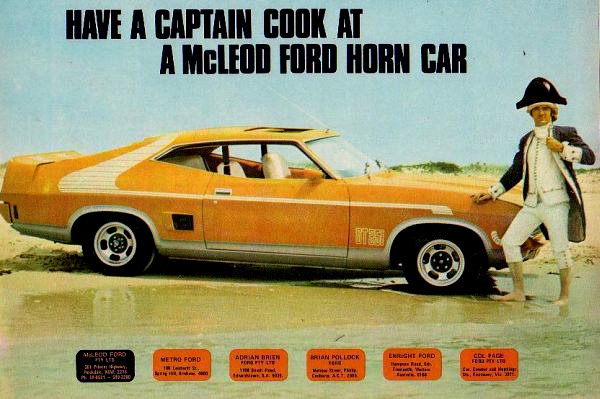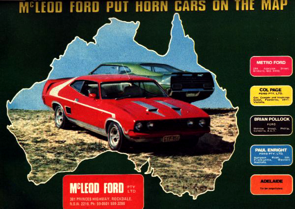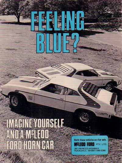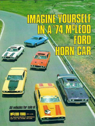 located in Rockdale, NSW during the 1970s and was a proud sponsor of race diver John Goss during this period. McLeod came up with the idea of adding accessories to his cars to make them 'stand out' and seem like each vehicle was 'unique.' The term "Horn Car" comes from the company - Horn Car Accessories - who supplied the various parts to McLeod Ford. The most prominent accessory was the large bodyside decal stripes added to the Falcon hardtops that came in various colours depending on the base colour of the car. They wrapped around the side and over the roof with additional striping on the bonnet. The John Goss 1974 Bathurst XA Falcon GT (No. 5) had these Horn Car stripes in white amongst the many sponsor decals on the car. Also available were various sized boot spoilers and sunroof fittings. The concept caught on with other Ford dealers ordering the Horn Car accessories which lasted from the XA through to the end of the XB Falcon run in mid 1976. The images below are a few of the 1970s adverts for the McLeod Ford Horn Car. |