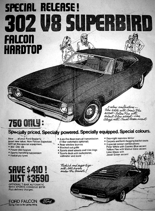 ![]() A Ford sales advert for the XA Superbird promoting the factory fitted 302ci V8. |