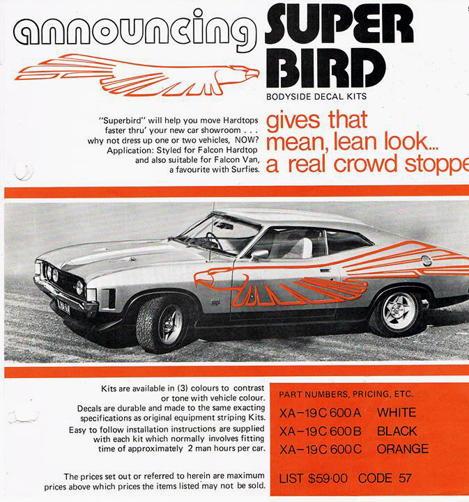 Show Car The original Superbird was a factory built XA Falcon GT Hardtop (reg.: LHA-614), designed by Ford Product Planning Director Nick Bartolini to draw crowds at the 1973 Melbourne and Sydney International Motor Shows. It was originally a Wild Violet (code: Z) coloured GT repainted overall Aluminium Silver finish with large, bold orange bodyside Falcon bird decals. It carried globe wheels with a two-tone rough wool trimmed interior. Aside from all the standard GT fittings, it also featured power steering, a laminated tinted band windscreen, air conditioning, power windows, LHS exterior R/V mirror, the super fringe deluxe radio, front spoiler and a long-range 36 gallon fuel tank. The show car proved so popular that Ford decided to factory produce a limited edition run of Falcon 500 Hardtops under the 'Superbird' banner but with revised, smaller decals. There was also dealer options for Superbird decal applications that retained the large decals of the show car. While being genuine Superbird decals, any vehicle they were applied too did not, of course, make them one of the 750 original XA Superbird factory builds. |