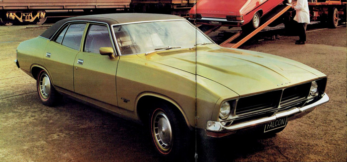 A factory fresh XB Falcon 500 sedan with black vinyl roof being shipped off to a dealer. |